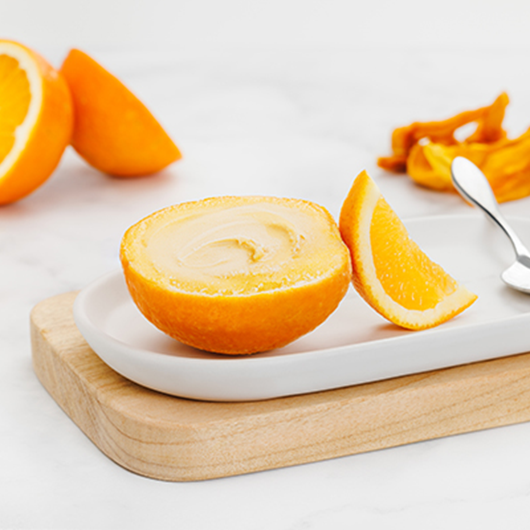 La vitalité d’un sorbet Mangue-Orange d’exception, présenté dans sa coque naturelle. Une recette 100% pure et vitaminée pour une expérience de dégustation tonique et rafraîchissante.